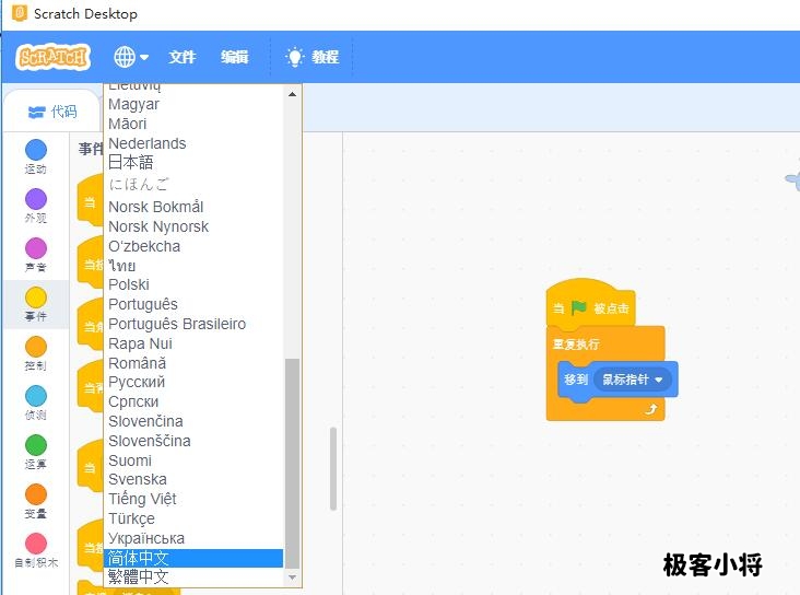 Scratch安裝好之后默認(rèn)為英文版,支持全球不同國家和地區(qū)57種語言,我們可以點擊界面左上的地球圖標(biāo)。下拉到最下邊,選擇簡體中文。這樣看起來舒服多了。