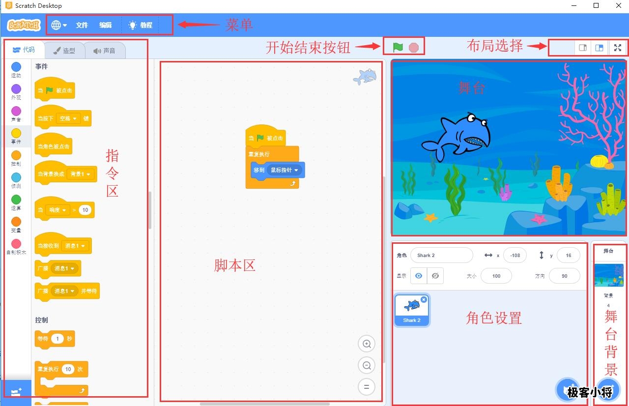 接下來講解Scratch界面布局,其主要布局分為以下5大部分,菜單欄、指令區(qū)、舞臺區(qū)、腳本區(qū)、角色區(qū),如下圖