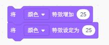 我們以上圖指令為例來講解。在選擇下拉菜單中,有顏色、魚眼、旋渦、像素畫、馬賽克、亮度、虛像(透明度)等特效,每次運行增加一定數值。可以理解為將此種特效,運行一次,增加一定程度,這個程度就是用后面的數字來量化表示。每種特效我們建議大家都親自試用一下。顯示隱藏