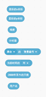 偵測基本參數指令包含的比較多,一一介紹如下:鼠標的X坐標:偵測鼠標光標的X坐標值鼠標的Y坐標:偵測鼠標光標的Y坐標值響度:偵測聲音輸入設備周圍聲音的響度(電腦要有聲音輸入設備)計時器:偵測從程序運行開始到此時的時間/秒舞臺的背景編號:偵測當前舞臺的背景圖編號當