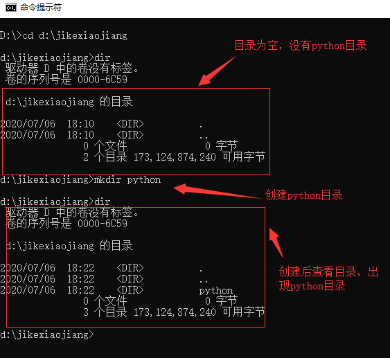 mkdir創建目錄的使用方法:在當前目錄下創建新的文件夾,例如我們在d盤jikexiaojiang目錄下創建python文件夾