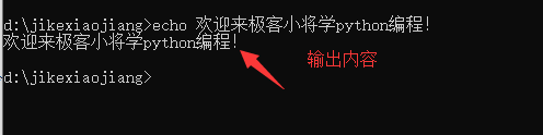 echo內容輸出命令:直接echo +要輸出的內容,比如我們輸出歡迎來極客小將學python編程!