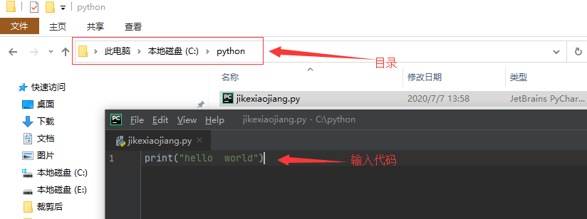 首先我們?cè)贑盤(pán)python文件夾目錄下建立jikexiaojiang.py文件。并且在jikexiaojiang.py文件中輸入print("hello world"),如下圖