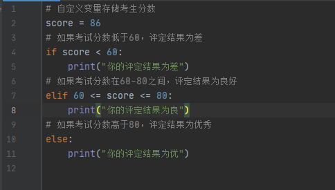 假如考試分數低于60分,考核結果是差;分數在60-80之間的,考核結果是良;分數大于80分的,考核結果是優。代碼如下: