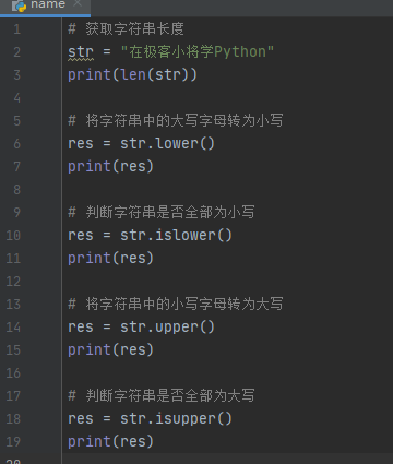 len(str):獲取字符串長度len(str),返回字符串str包含的字符個數。str.lower():字符串大寫轉小寫操作,將字符串str中的英文字母全部轉換為小寫的英文字母,返回一個字符串。str.upper():字符串小寫轉大寫操作,將字符串str中的英文字母全部轉換為大寫的英文字母,返回一個