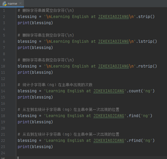 str.rstrip() :函數(shù)名中的前綴r是單詞right的簡(jiǎn)寫(xiě),該方法用來(lái)刪除字符串最右邊的空白字符,返回一個(gè)尾部不包含空白字符的新字符串。