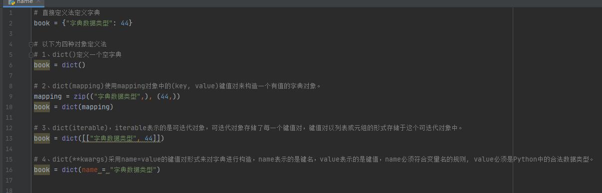 字典的類型名為dict。字典的定義同樣分為兩種,直接定義法和對象定義法: