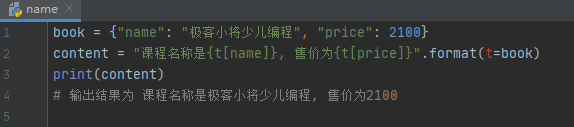 "{param[key]}".format(param=dict):字符串中待格式化的占位符與字典的形式一致,用{}括起來。在{}中以鍵名訪問的形式輸出對應(yīng)的鍵值。在format方法中以關(guān)鍵字參數(shù)的形式傳遞字典對象。在Python中調(diào)用函數(shù)時,形如name=value的參數(shù)傳遞形式,即為關(guān)鍵字參數(shù)的傳遞語法。