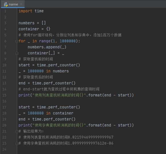 哈希表中的編號(hào)即為鍵名的哈希值,數(shù)據(jù)表中存儲(chǔ)了哈希值,以及鍵名,鍵值。Python字典的底層實(shí)現(xiàn)中,并非直接存儲(chǔ)鍵名,鍵值,存儲(chǔ)的是它們的引用。哈希(hash)函數(shù)又稱(chēng)為散列函數(shù),計(jì)算鍵名的哈希值,就是將字典中的鍵名轉(zhuǎn)換為對(duì)應(yīng)的數(shù)字編號(hào)。現(xiàn)在來(lái)寫(xiě)個(gè)簡(jiǎn)單的代碼,來(lái)比較列表和字典的查找性能。