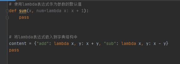 由于lambda的簡化性,也注定他不能實現復雜的邏輯代碼。因此經常使用lambda表達式作為參數的默認值、將lambda表達式嵌入到字典結構中以及將lambda表達式作為返回值,以下舉例說明:
