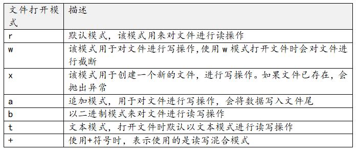 file 對(duì)應(yīng)的是文件的路徑名,mode 對(duì)應(yīng)的是文件的打開模式,buffering對(duì)應(yīng)的是文件緩沖,encoding對(duì)應(yīng)的是文件數(shù)據(jù)流的編碼, errors表示的是對(duì)文件的讀寫過(guò)程中出現(xiàn)了編碼問題時(shí),該以什么樣的方式進(jìn)行處理。在通過(guò)open函數(shù)對(duì)文件進(jìn)行讀寫操作前,我們需要先掌握文件的打開模式。
