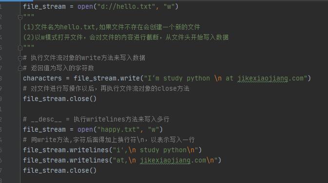 file_stream.writelines(lines):這里的lines既可以是字符串類型,也可以是序列類型,如果是序列類型,元素必須是字符串。在writelines方法中,同樣得手動(dòng)地在字符串后面加上換行符,以表示一行。writelines方法沒有返回值。