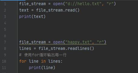 在執(zhí)行open方法獲取文件流對(duì)象以后,可以直接使用for循環(huán)來(lái)對(duì)文件流對(duì)象進(jìn)行逐行讀取。