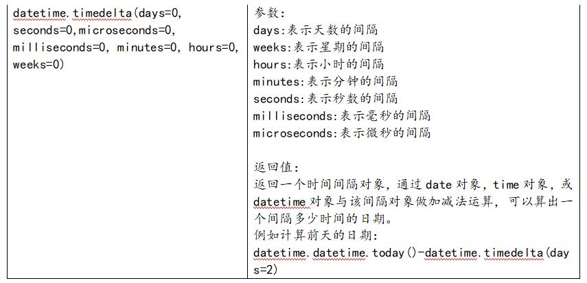 4. timedelta:表示兩個 date 對象,或者 time 對象,或者 datetime 對象之間的時間間隔,精確到微秒。