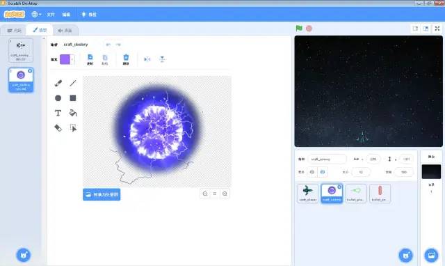 適用于當前角色:這個變量只限當前角色,不能在角色間共享。可以理解為它們分別是“全局變量”和“局部變量” 同時我們也建立“全局變量”ey,這樣通過兩個“全局變量”ex和ey將敵機(craft_enemy)發射子彈瞬間的坐標記錄,讓敵機子彈克隆體(bullet_enemy)去訪問坐標完成自己初始化的操作 建立變量ex和ey