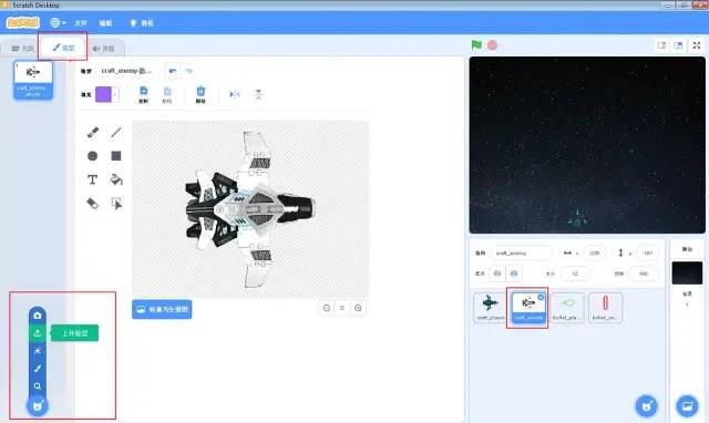 接下來,這個小節我們介紹如何生成敵機 利用之前所學的知識,我們可以很容易的生成敵機 選擇craft_enemy(敵機)角色,先點擊“隱藏”,將角色本體隱藏。