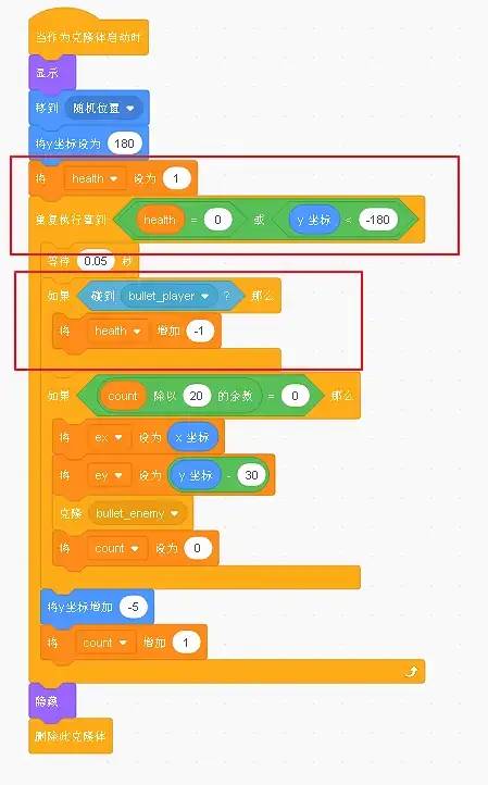 接下來,當敵機作為克隆體出現時,我們需要控制它在隨機位置的頂部出現,出現后每隔一段時間向下飛行一段距離,直至到達底部,完整積木組合如下