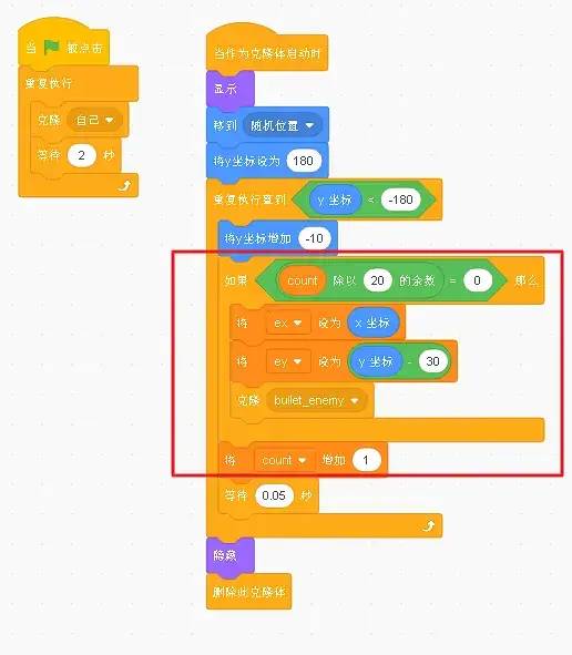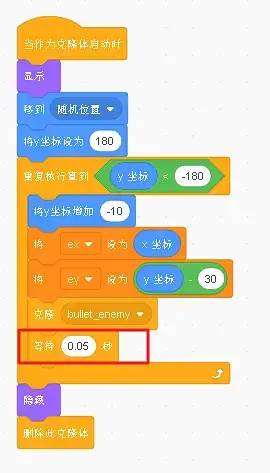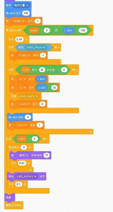 在敵機的移動邏輯中添加生成子彈的積木,敵機(craft_enemy)角色修改后的全部內容如下