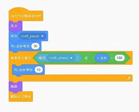 上一小節我們講了如何發射一顆bullet_player(子彈),本小節我們利用克隆功能完成子彈的自動發射功能 首先點擊craft_player角色,查看代碼。找到“控制”中的“克隆”積木。這個積木的作用是復制某個角色。