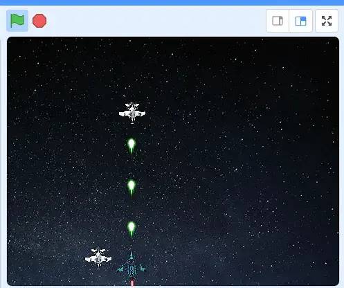 原因在于bullet_player中的代碼,是當“綠旗子”觸發時,才執行一系列操作,飛機移動時,克隆的子彈并沒有隨著飛機移動。