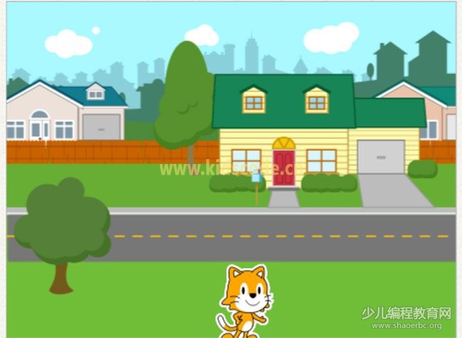 1、 打開app,新建項(xiàng)目,刪除默認(rèn)的小貓角色,添加海灘背景,和兩個角色,小兔、螃蟹,并將兩個角色放置在舞臺左側(cè)同一起跑線上,如上圖所示。