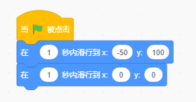 此指令表示,在一秒時間內勻速的移動到指定坐標位置(x:-50,y:100),然后在下一秒內勻速的移動到幕布背景原點,點擊綠旗運行按鈕可以查看效果。