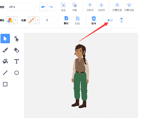 箭頭所指的功能為角色翻轉,將角色翻轉后添加到舞臺區,添加對話內容,如下圖: