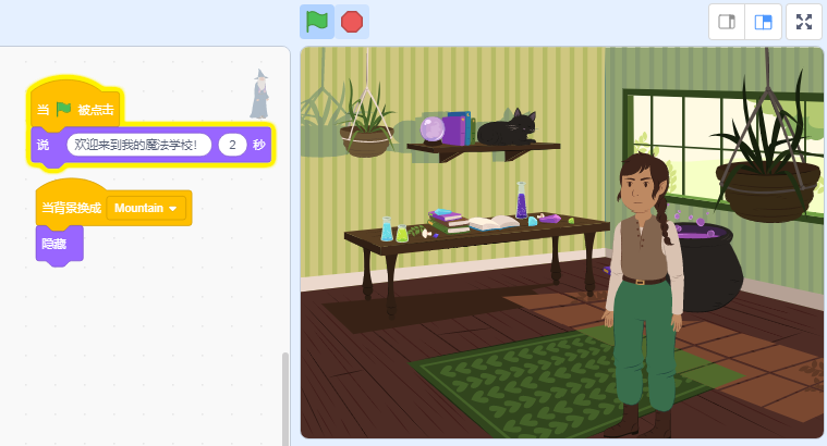 本節課的內容較多,通過這節課的學習,我們不僅能復習之前所學的知識,更可以學習一些Scratch故事的創作思路。學完這節課,同學們可以舉一反三,自己創作出更多有意思的故事,講給爸爸媽媽或者其他同學們聽。首先我們添加背景和角色,并讓這個角色說些話: