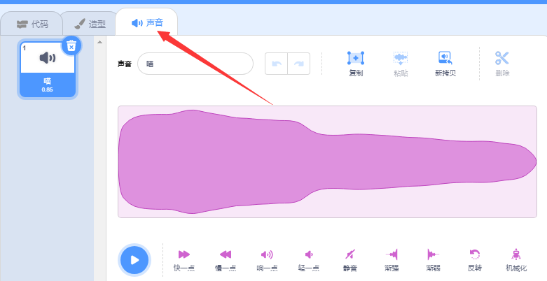 上節(jié)課我們通過口技的演示,簡單了解的聲音的輸入輸出。這節(jié)課我們詳細講解如何錄制聲音,點擊Scratch界面左上角選項卡,切換到聲音面板,如下: