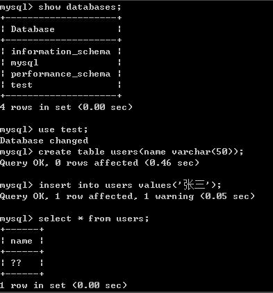 show databases; use test; create table users(name varchar(50)); insert into users values('張三'); select * from users;