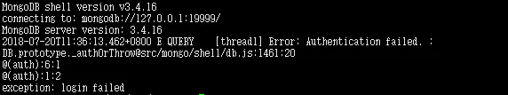 mongo --port 27017 -u "登錄名" -p "密碼" --authenticationDatabase "數據庫名"如果驗證失敗會在命令行打印如下信息YaG少兒編程網-Scratch_Python_教程_免費兒童編程學習平臺