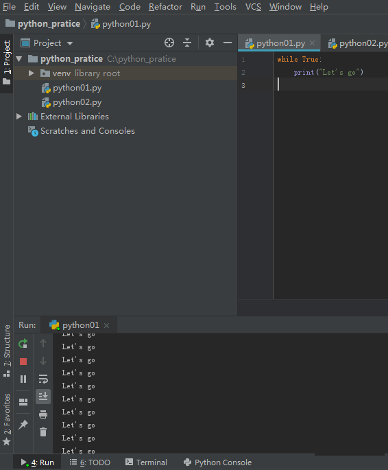 3、在pycharm里面出現死循環,要在下方才能看得出。8MD少兒編程網-Scratch_Python_教程_免費兒童編程學習平臺