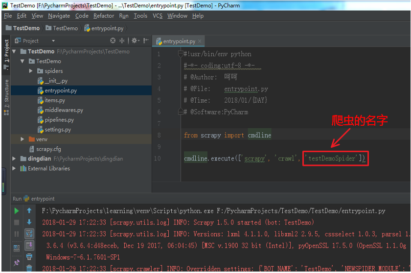 法二:在TestDemoSpider目錄和scrapy.cfg同級目錄下面,新建一個entrypoint.py文件,如圖: