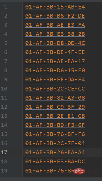 import random import string def create_mac(): MAC='01-AF-3B' hex_num =string.hexdigits #0123456789abcdefABCDEF for i in range(3): n = random.sample(hex_num,2) sn = '-' + ''.join(n).upper() MAC += sn return MAC def main(): with open('mac.txt','w') as f: for i in range(100): mac = create_mac() print(mac) f.write(mac+' ') main()復制代碼