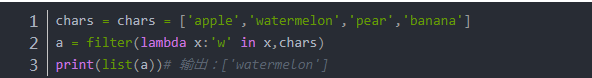 filter()函數輕松完成了任務,它用于過濾序列,過濾掉不符合條件的元素,返回一個迭代器對象。filter()函數和map()、reduce()函數類似,都是將序列里的每個元素映射到函數,**終返回結果。我們再試試,如何從許多單詞里挑出包含字母w的單詞。gdO少兒編程網-Scratch_Python_教程_免費兒童編程學習平臺