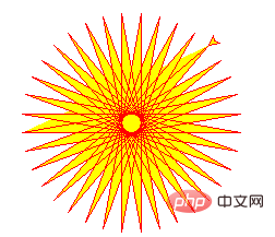# coding=utf-8 import turtle import time # 同時設置pencolor=color1, fillcolor=color2 turtle.color("red", "yellow") turtle.begin_fill() for _ in range(50): turtle.forward(200) turtle.left(170) turtle.end_fill() turtle.mainloop()