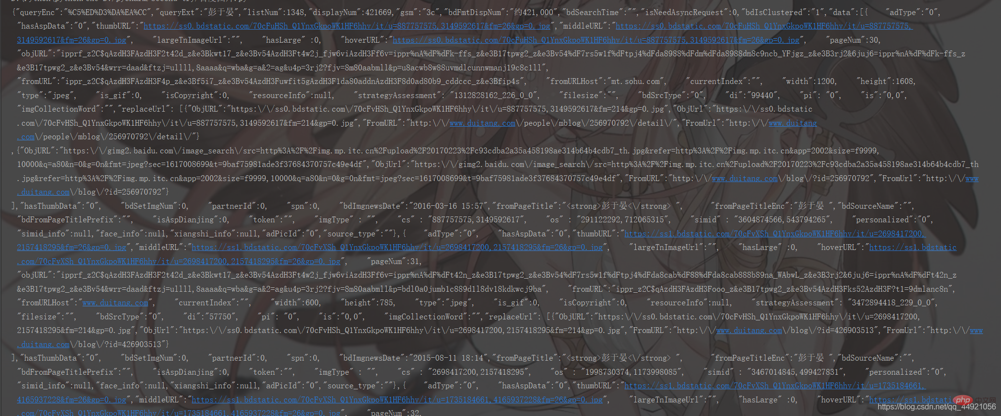 url = 'https://image.baidu.com/search/acjson?' param = { 'tn': 'resultjson_com', 'logid': ' 7517080705015306512', 'ipn': 'rj', 'ct': '201326592', 'is': '', 'fp': 'result', 'queryWord': '彭于晏', 'cl': '2', 'lm': '-1', 'ie': 'utf-8', 'oe': 'utf-8', 'adpicid': '', 'st': '', 'z': '', 'ic': '', 'hd': '', 'latest': '', 'copyright': '', 'word': '彭于晏', 's': '', 'se': '', 'tab': '', 'width': '', 'height': '', 'face': '', 'istype': '', 'qc': '', 'nc': '1', 'fr': '', 'expermode': '', 'force': '', 'cg': 'star', 'pn': '30', 'rn': '30', 'gsm': '1e', } # 將編碼形式轉換為utf-8 response = requests.get(url=url, headers=header, params=param) response.encoding = 'utf-8' response = response.text print(response)運行結果如下: