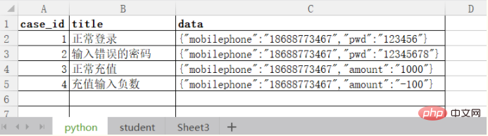 [{'title': '正常登錄', 'case_id': 1, 'data': '{"mobilephone":"18688773467","pwd":"123456"}'}, {'title': '輸入錯誤的密碼', 'case_id': 2, 'data': '{"mobilephone":"18688773467","pwd":"12345678"}'}, {'title': '正常充值', 'case_id': 3, 'data': '{"mobilephone":"18688773467","amount":"1000"}'}, {'title': '充值輸入負數', 'case_id': 4, 'data': '{"mobilephone":"18688773467","amount":"-100"}'}]相關免費學習推薦:python視頻教程QiT少兒編程網-https://www.pxcodes.com