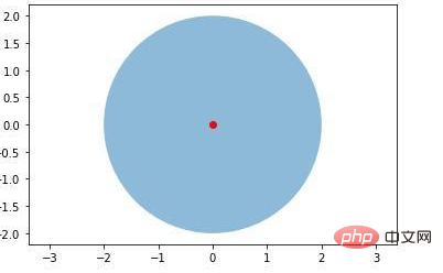 from matplotlib.patches import Ellipse, Circle import matplotlib.pyplot as plt def plot_cicle(): fig = plt.figure() ax = fig.add_subplot(111) cir1 = Circle(xy = (0.0, 0.0), radius=2, alpha=0.5) ax.add_patch(cir1) x, y = 0, 0 ax.plot(x, y, 'ro') plt.axis('scaled') plt.axis('equal') #changes limits of x or y axis so that equal increments of x and y have the same length plt.show() plot_cicle()
