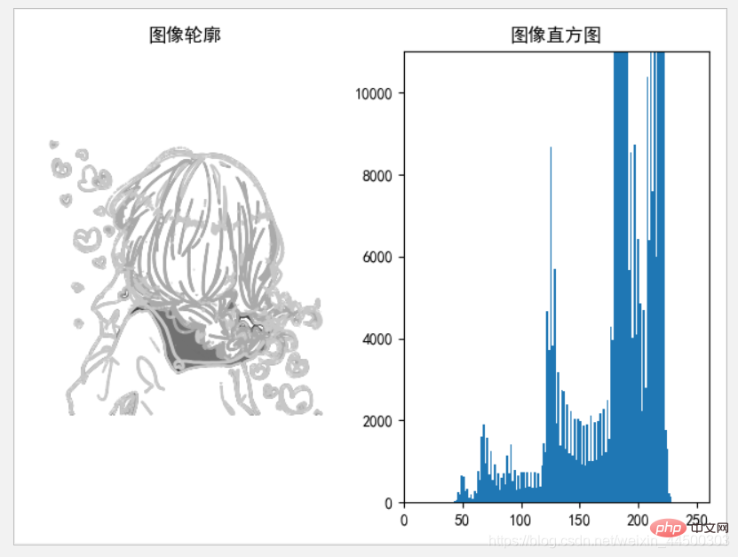 from PIL import Imagefrom pylab import *# 解決中文亂碼plt.rcParams['font.sans-serif'] = 'SimHei'plt.rcParams['axes.unicode_minus'] = False#im = array(Image.open('headimage.jpeg').convert('L')) # 打開圖像,并轉成灰度圖像print(im)figure()subplot(121)gray()contour(im, origin='image') #畫圖axis('equal') # 自動調整比例axis('off') # 去除x y軸上的刻度title(u'圖像輪廓')subplot(122)# flatten()函數可以執行展平操作,返回一個一維數組hist(im.flatten(), 128)print(im.flatten())title(u'圖像直方圖')plt.xlim([0,260])plt.ylim([0,11000])show()運行結果