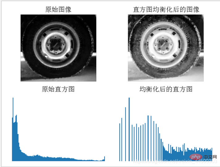 # -*- coding: utf-8 -*-from PIL import Imagefrom pylab import *from PCV.tools import imtools# 添加中文字體支持from matplotlib.font_manager import FontProperties font = FontProperties(fname=r"c:windowsfontsSimSun.ttc", size=14)im = array(Image.open('tire.jpg').convert('L')) # 打開圖像,并轉成灰度圖像im2, cdf = imtools.histeq(im)figure()subplot(2, 2, 1)axis('off')gray()title(u'原始圖像', fontproperties=font)imshow(im)subplot(2, 2, 2)axis('off')title(u'直方圖均衡化后的圖像', fontproperties=font)imshow(im2)subplot(2, 2, 3)axis('off')title(u'原始直方圖', fontproperties=font)hist(im.flatten(), 128, density=True)subplot(2, 2, 4)axis('off')title(u'均衡化后的直方圖', fontproperties=font)hist(im2.flatten(), 128, density=True)show()運行結果