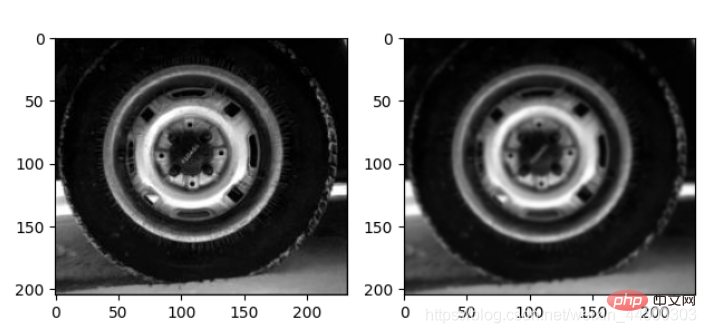 import cv2import matplotlib.pyplot as plt im=cv2.imread("tire.jpg")# 高斯濾波img_Guassian = cv2.GaussianBlur(im,(5,5),0)plt.subplot(121)plt.imshow(im)plt.subplot(122)plt.imshow(img_Guassian)plt.show()運行結果