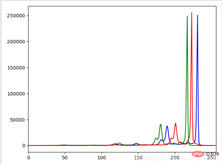 import cv2from matplotlib import pyplot as plt img = cv2.imread('headimage.jpeg',1)color = ('b','g','r')for i,col in enumerate(color): histr = cv2.calcHist([img],[i],None,[256],[0,256]) plt.plot(histr,color = col) plt.xlim([0,256])plt.show()運行結果