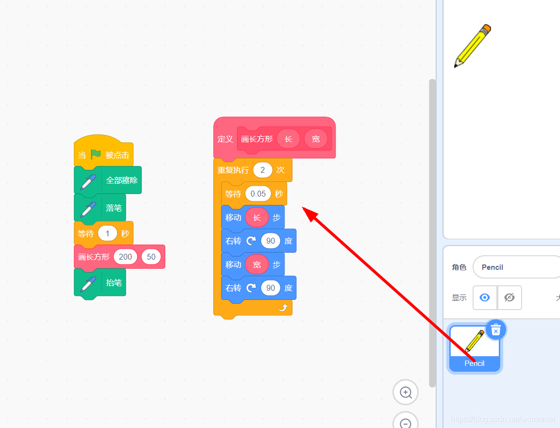 您現在的位置是:首頁 » scratch編程資訊 資訊內容 scratch自制積木教程案例 自制積木 極客小將2022-04-07- 積木:一個程序里面有多個角色需要用到同一腳本,那么將這個腳本定義為一個積木,我們就可以直接用這個積木來代替腳本項目介紹:根據傳遞的參數畫一個長方形。 積木:一個程序里面有多個角色需要用到同一腳本,那么將這個腳本定義為一個積木,我們就可以直接用這個積木來代替腳本項目介紹:根據傳遞的參數畫一個長方形。 ←微信掃描關注公眾號,免費獲取相關素材源碼。 最新版Scratch3.29.1編程軟件 Scratch積木指令學習手冊 Scratch飛機大戰素材.zip Scratch植物大戰僵尸素材.zip Scratch羊了個羊.zip Scratch計算器源碼.zip Scratch五子棋源碼.zip Scratch俄羅斯方塊源碼.zip Scratch打地鼠源碼.zip Scratch大家來找茬源碼.zip Scratch數獨源碼.zip Scratch川劇變臉源碼.zip Scratch電子學會等級考試白皮書 Scratch藍橋杯資料 上百款資料、源碼,關注領取。 本文地址:http://www.91zz.cn/202204072_2675.html 上一篇 Scratch教程-圖章工具 劇本介紹:每年春天我們都需要參加植樹活動,根據鼠標所點的位置進行植樹。代碼截圖: 下一篇 2025學年面向中小學生的全國性競賽活動名單 2025學年面向中小學生的全國性競賽活動名單?序號競賽名稱主辦單位競賽面向學段自然科學素養類1第五屆全國青少年人工智能創新挑戰賽中國少年兒童發展服務中心小學、初中、高中、中專、職高2全國中小學信息技術創新與實踐大賽城鄉統籌發展研究中心、中國人工智能學會 相關資訊 scratch如何使用自制積木 scratch自制積木教程案例 Scratch編程NO40課:自制積木的使用 預約試聽課 已有385人預約都是免費的,你也試試吧...