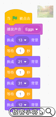 場景介紹:在悠揚的音樂中,相片一張一張自動播放。知識點:①從本地文件導入背景②切換背景,積木“下一個背景”③導入本地音頻文件,播放音樂評價點:①點擊綠旗后,背景一張一張自動播放②播放背景音樂拓展練習:制作不同主題的電子相冊,例如人物篇、風景篇