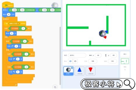 場景介紹:小車在舞臺上移動,能夠自動躲避障礙。知識點:①廣播并等待②紅外傳感器的原理評價點:①角色的導入和背景的繪制②左右探測儀跟隨機器人移動③機器人根據探測判斷并避障拓展練習:①添加音效②設置難度遞增的關卡③根據探測設置不同的避障方式