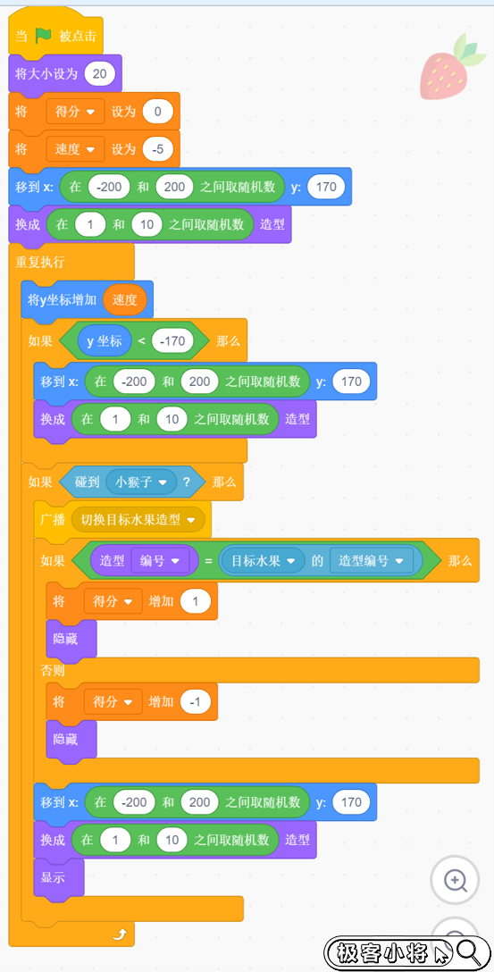 程序介紹:秋天來了,各種水果都成熟了,紛紛從樹上掉下來,目標物品在屏幕左上角不斷變化,接到正確的得分,否則減分。知識點:①新建變量②初始化變量③改變變量的值④角色造型號⑤隨機數評價點:①小猴子可以左右移動②接到目標水果加一分,接到錯誤水果減一分③目標水果隨