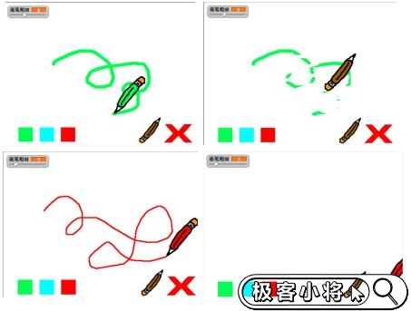 場景介紹:當按下鼠標時,畫出線段,可以選擇顏色和橡皮擦,設置畫筆粗細和清空畫板。知識點:①設置畫筆顏色②設置畫筆粗細③清空④廣播消息評價點:①點擊顏色,畫筆變化造型,線段顏色變化②選擇橡皮擦,可以擦除線段③可以清空屏幕④可以設置畫筆粗細拓展練習:①增加更多
