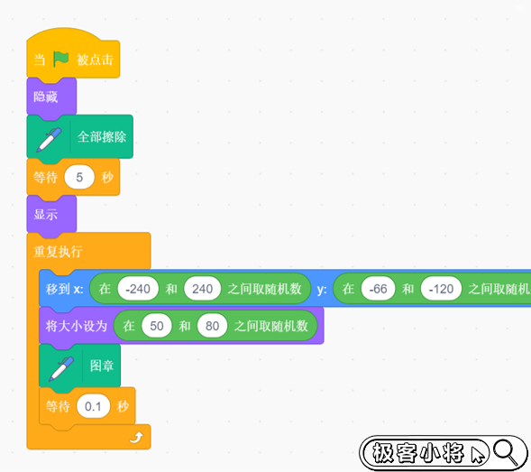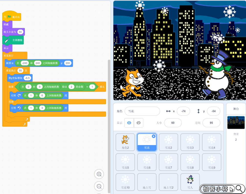 ①點擊綠旗后,雪花從天空中隨機位置落下