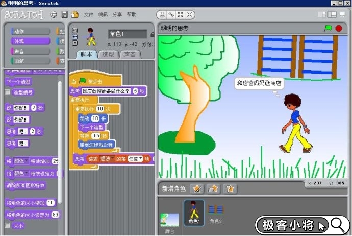 老師打開“動畫”文件夾中的第二個“創意”示例,說:“開學了。信息技術課上,老師給我們介紹了一門新課程。他顯然想到了我能用這個劃痕軟件做什么。“下課后,他在校園里走了一會兒,想著想著,來來回回走著想了很多問題,比如“玩游戲”、“在網絡上發現”、“問朋友”、“做動畫”、“編故事”、“作曲”……今天我們來探討一下下面這個例子——明明的想法。